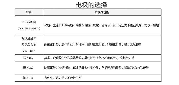 電 極:不銹鋼316L、哈氏合金(HB和HC)、鈦、鉭、鉑