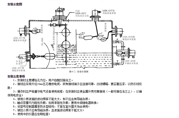 實(shí)例:UQK-01TA2-70-0.8表示選用普通型浮球液位控制器,采用可調(diào)垂直安裝方式,常壓工作,連接法蘭DN80,安裝尺寸70mm,介質(zhì)密度為0.8g/cm3。