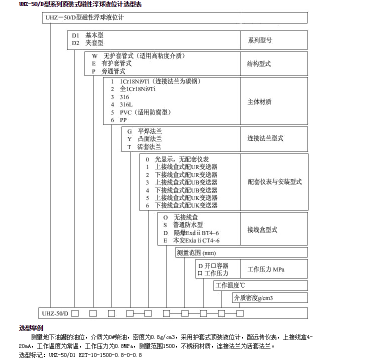 UHZ-50/D1,UHZ-50/D2,UHZ-50/D1-E2T-10-1500-0.8-0-0.8,頂裝式磁性浮球液位計