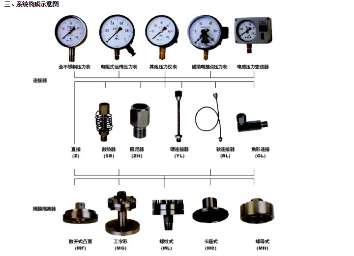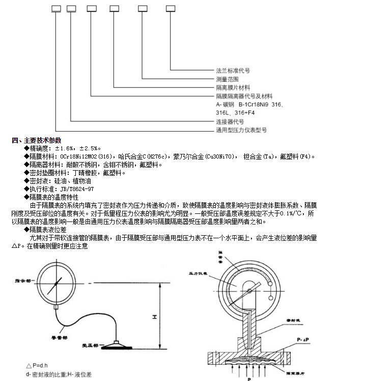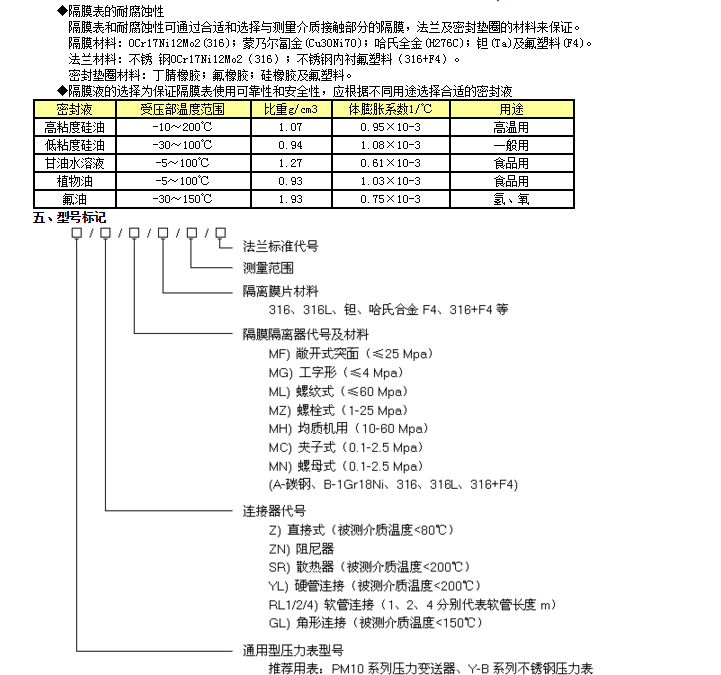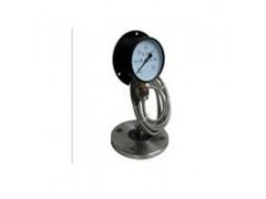 隔膜壓力表由各種通用型壓力儀表和不同結(jié)構(gòu)的隔膜隔離器組成一個(gè)封閉系統(tǒng),內(nèi)充密封液。當(dāng)被測(cè)介質(zhì)的壓力作用于隔膜時(shí),則隔膜產(chǎn)生變形,壓縮封閉系統(tǒng)中的密封液。由于密封液的固有性質(zhì),使壓力儀表中的彈性元件產(chǎn)生相應(yīng)的彈性變形一位移,經(jīng)指示裝置顯示壓力值。當(dāng)隔膜的剛度足夠小時(shí),則壓力儀表指示的壓力就近于被測(cè)介質(zhì)的壓力值。
