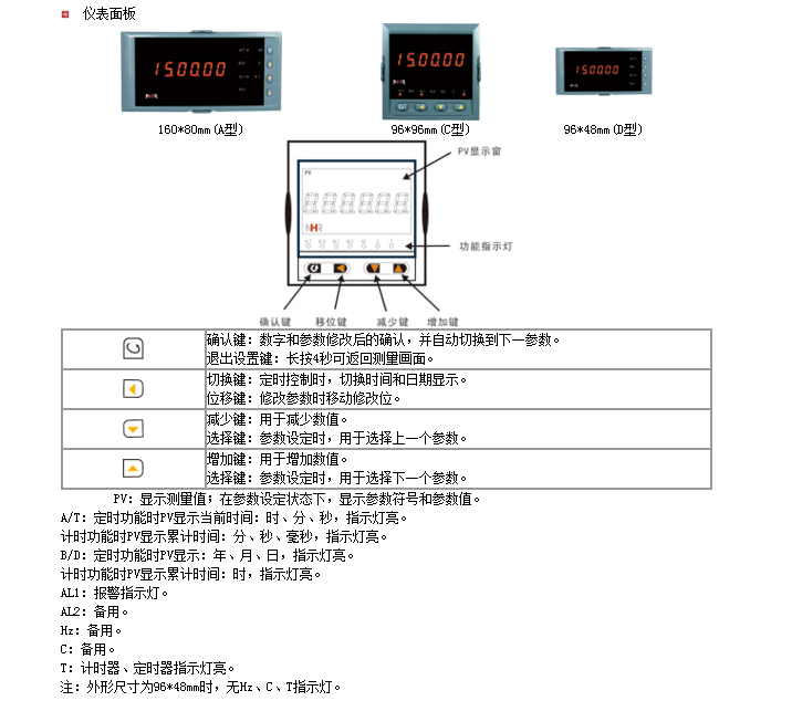 概述 NHR-2100/2200系列定時器/計時器采用全自動貼片封裝工藝,具有很強的抗干擾能力,并具有多種輸出功能和控制功能,廣泛運用于電力、石化、冶金、輕工、制藥、航空等諸多領(lǐng)域。 6位LED數(shù)碼顯示,顯示范圍寬,并且顯示亮度可以調(diào)整。 具備遞增和遞減兩種計時方式。 具備“定時報警”、“計時報警”功能,帶LED報警燈指示;計時報警時,可選200mS脈寬同步輸出,同時儀表將自動清零且停止報警,并重新開始計時。 支持RS485、RS232串行接口,采用標準MODBUS RTU通訊協(xié)議。 具備儀表按鍵啟動、停止、清零功能操作,也可外接啟動、停止、清零功能按鈕。 輸出、電源、通訊相互之間采用光電隔離技術(shù)。 具備多種外形尺寸及樣式供用戶選擇。 面板輕觸式按鍵設(shè)置,參數(shù)設(shè)置斷電永久保存。