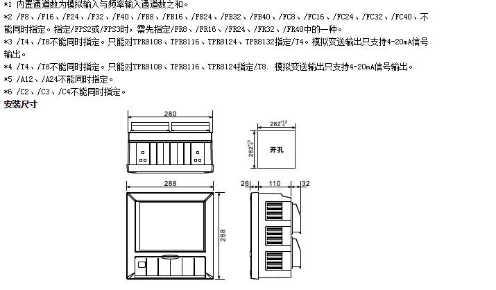 | ●報警輸出繼電器(/A12,/A24): 輸出點數(shù):從12、24點中選擇。 ●通信功能(/C2,/C3) 媒體:RS-232(/C2)或RS-485(/C3) 協(xié)議:Modbus-RTU(從機)協(xié)議 通信速率:1200/2400/4800/9600/19200/38400/57600 ●打印功能(/C4) 打印機:面板式微型打印機。 打印內(nèi)容:實時數(shù)據(jù)、歷史數(shù)據(jù)、累積報表。 打印方式:手工打印、定時打印。 ●模擬輸出(/T4,/T8) 信號類型:4-20mA 輸出點數(shù):從4,8點中選擇。 輸出方式:測量通道的變送輸出。 最大負載:750Ω ●24VDC變送器電源輸出(TP8): 輸出點數(shù):8回路。 輸出電壓:24VDC。 額定輸出電流:4~20MADC。 最大輸出電流:65mAdc(過電流保護動作電流:約90mA) |