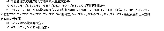 | ●報(bào)警輸出繼電器(/A6,/A12): 輸出點(diǎn)數(shù):從6、12點(diǎn)中選擇。 ●通信功能(/C2,/C3) 媒體:RS-232(/C2)或RS-485(/C3) 協(xié)議:Modbus-RTU(從機(jī))協(xié)議 通信速率:1200/2400/4800/9600/19200/38400/57600 ●打印功能(/C4) 打印機(jī):面板式微型打印機(jī)(僅支持McuP系列打印機(jī))。 打印內(nèi)容:實(shí)時(shí)數(shù)據(jù)、歷史數(shù)據(jù)、累積報(bào)表。 打印方式:手工打印、定時(shí)打印。 ●模擬輸出(/T1,/T2,/T3,/T4) 信號(hào)類型:4-20mA 輸出點(diǎn)數(shù):從1~4點(diǎn)中選擇。 輸出方式:測量通道的變送輸出。 最大負(fù)載:750Ω ●24VDC變送器電源輸出(TP4): 輸出電壓:24VDC。 額定輸出電流:4~20MADC。 最大輸出電流:65mAdc(過電流保護(hù)動(dòng)作電流:約90mA) |