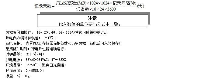 記錄時(shí)間:記錄時(shí)間的長短與FLASH存儲(chǔ)器容量、輸入點(diǎn)數(shù)、記錄間隔有關(guān),計(jì)算公式如下: