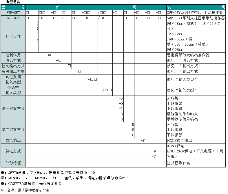 SWP-GFY系列數(shù)字/光柱顯示智能伺服放大輸出操作器是伺服放大器、手動操作器和后備功能一體化智能產(chǎn)品,接收0-10mA/4-20mA/0-5V/1-5V閥位給定輸出信號,輸出正轉、反轉控制信號。適合于作為DOS系統(tǒng)回路調(diào)節(jié)控制輸出和智能調(diào)節(jié)器控制輸出的后備操作器使用。