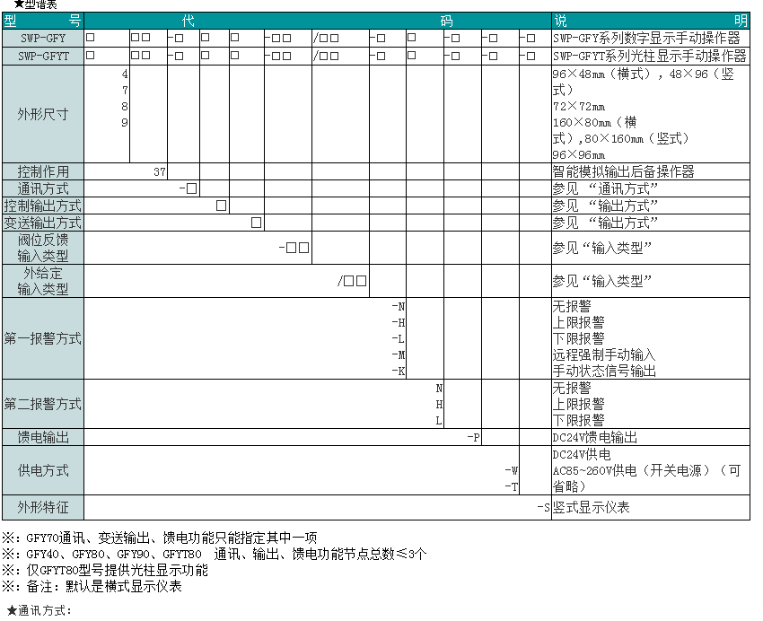 SWP-GFY系列數(shù)字/光柱顯示智能模擬輸出操作器接收從DCS系統(tǒng)或智能調(diào)節(jié)器來的0-10mA/4-20mA/0-5V/1-5V閥位給定輸出信號,再由伺服放大器去驅(qū)動電動調(diào)節(jié)閥門或由電氣轉(zhuǎn)換器和閥門定位器去驅(qū)動氣動薄膜閥,適合于作為DOS系統(tǒng)回路調(diào)節(jié)控制輸出和智能調(diào)節(jié)器控制輸出的后備操作器使用。