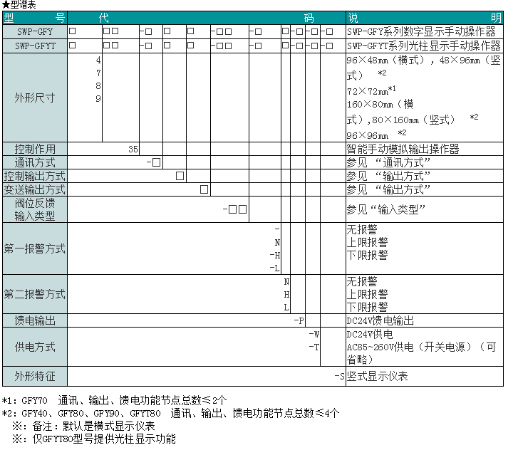 SWP-GFY系列數(shù)字/光柱顯示手動模擬輸出操作器可通過按鍵操作,直接輸出0-10mA或4-20mA或0-5V或1-5V閥位給定信號,再由伺服放大器驅(qū)動電動調(diào)節(jié)閥門或由電氣轉(zhuǎn)換器和閥門定位器驅(qū)動氣動薄膜閥,適用于各種閥門的手動給定控制。