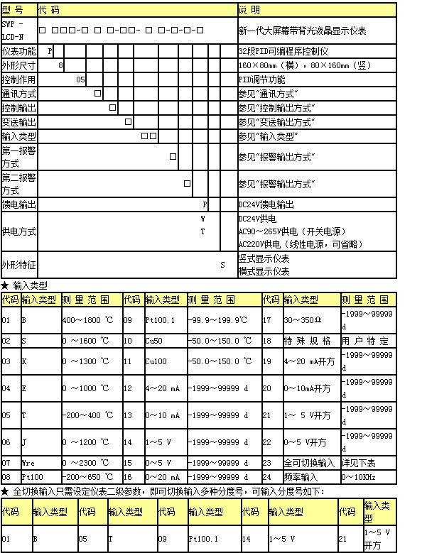 | 1、用戶依照儀表LCD顯示屏中文菜單提示,通過面板按鍵可完成輸入信號類型與分度號的自由切換,實(shí)現(xiàn)萬能輸入 |