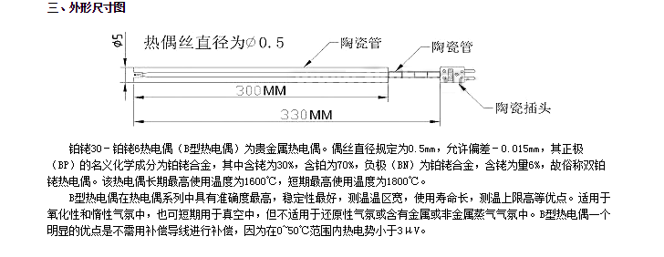 分度號(hào):B、R、S型。 L=310*280 L=915 L=853 替代進(jìn)口熱電偶測(cè)量溫度。