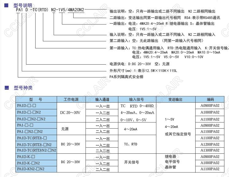 PA1D-TCN2,PA1D-RTCN2,PA1D-TC/RTCN2-1V5/4MA20N2,PA隔離式安全柵