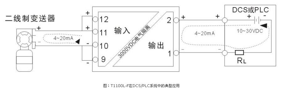 此模塊廣泛應用在DCS和PLC系統(tǒng),在系統(tǒng)信號檢測回路中,通過金升陽隔離變送器模塊T1100L-F模塊既能通過對輸出側取電(即輸出回路供電)供模塊正常工作,無需外接電源,有效地解決對供電電源的依賴,滿足二線制回路供電的要求,又能有效地濾除信號中的干擾噪聲,實現(xiàn)系統(tǒng)狀態(tài)精準檢測,保證系統(tǒng)可靠穩(wěn)定運行,安裝方便,可節(jié)省大量電纜和安裝維護成本,具體典型應用方案如下圖所示: