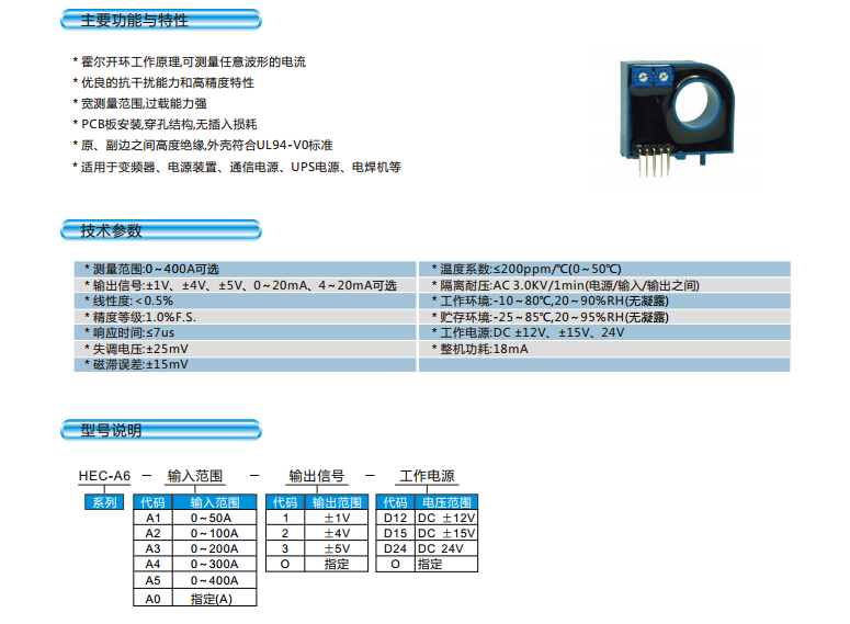 HEC-A6,HEC-A6-A1,HEC-A6-A2,HEC-A6-A3,HEC-A6-A4,HEC-A6-A5,HEC-A6-A0 電流傳感器