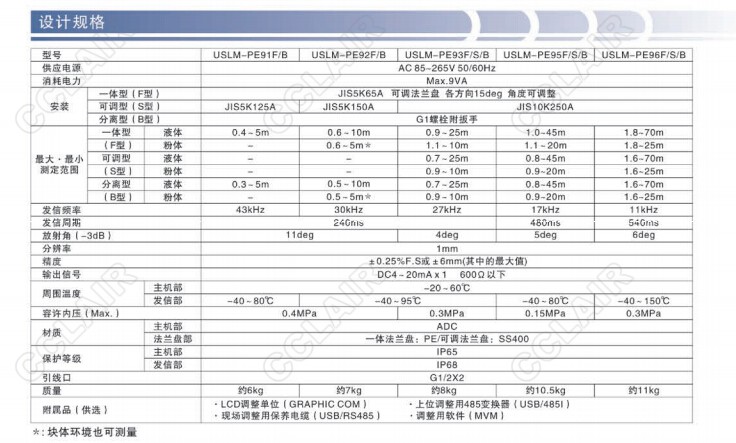 USLM,USLM-PE91F/B,USLM-PE92F/B,USLM-PE93F/S/B,USLM-PE95F/S/B,超聲波料位計