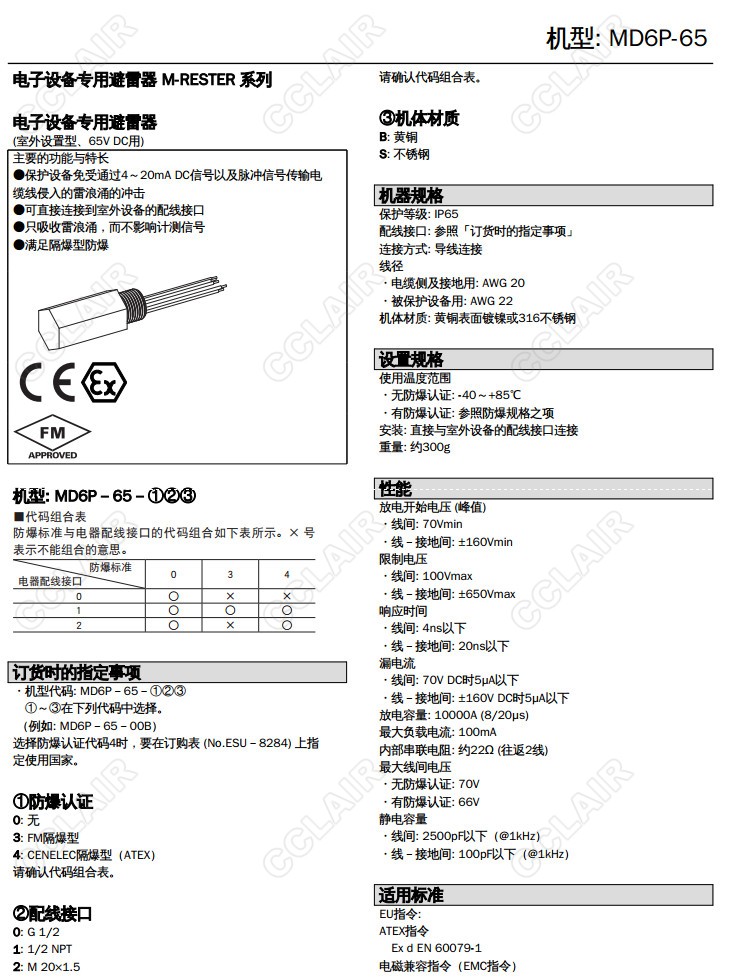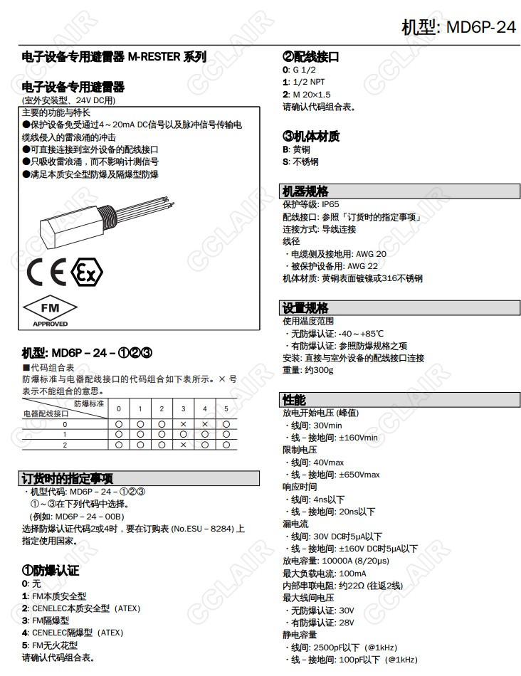MD6P-24/MD6P-65,MD6P-24-00B,4-20mA直流、脈沖信號用 室外安裝型 引線連接型 堵頭型,避雷器