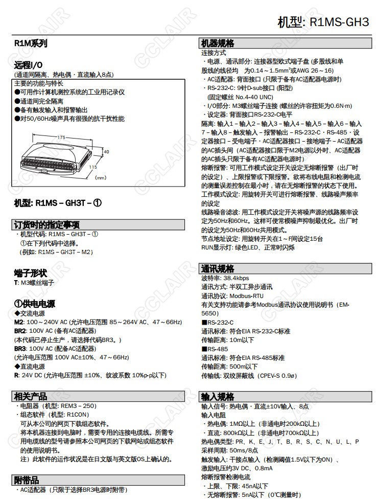 R1MS-GH3,R1MS-GH3T-M2,R1MS-GH3T-BR3,R1MS-GH3T-R,通道相互間完全隔離直流直 流/熱電偶 8點輸入模塊