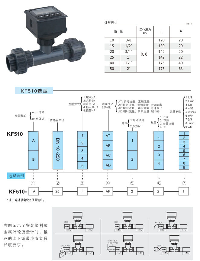 KF510-A-10,KF510-A-15,KF510-A-20,KF510-A-25,KF510-A-40,KF510-A-50,KP插管連接葉輪流量計(jì)