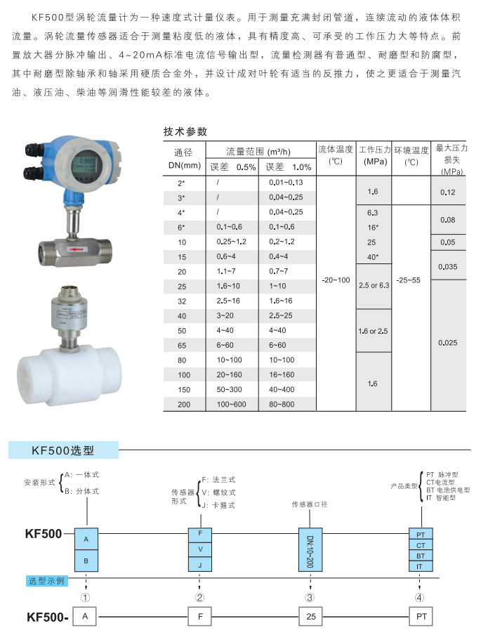 KF500-A-F-50,KF500-A-V-65,KF500-A-J-80,KF500-A-F-100,KF500-A-V-150,KF500-A-J-200,渦輪流量計(jì)