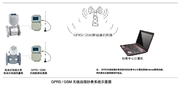 GPRS無(wú)線遠(yuǎn)程抄表系統(tǒng)由:電池水表、GPRS無(wú)線數(shù)據(jù)采集器、GSM移動(dòng)公網(wǎng)、Internet互聯(lián)網(wǎng)、具備互聯(lián)網(wǎng)固定IP地址的抄表中心計(jì)算機(jī)及中心計(jì)算機(jī)管理軟件組成。