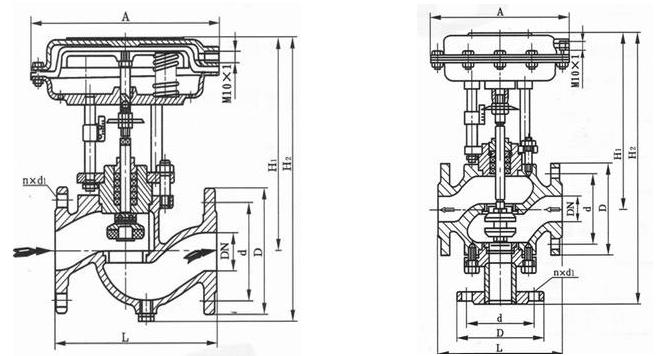 本系列產(chǎn)品有薄膜式、活塞式兩種。閥體結(jié)構(gòu)有單座、套筒、雙座(二位三通)三種,密封形式有填料密封和波紋管密封兩種,產(chǎn)品公稱壓力等級(jí)有PN10、 16、40、46四種,公稱口徑范圍DN20~200mm。適用流體溫度由-60~450℃。泄漏量等級(jí)為IV級(jí)或VI級(jí)。流量特性為快開。