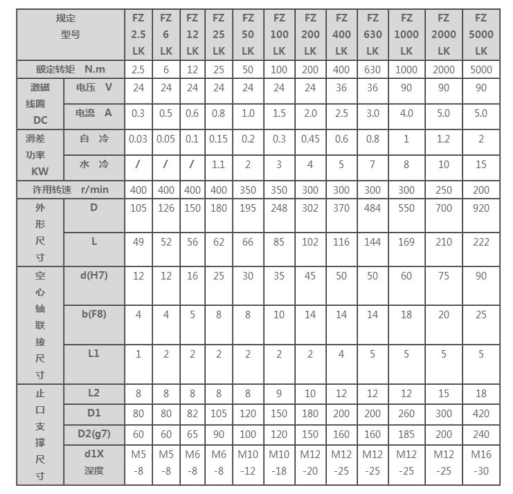 FZ-LK型(空心軸、止口支撐、)立式磁粉制動器扭矩:2.5~5000N.m,可選擇水冷或自然冷卻方式,額定電壓DC24V,FZ-LK型磁粉制動器額定轉(zhuǎn)矩越大,其許用轉(zhuǎn)速會降低。