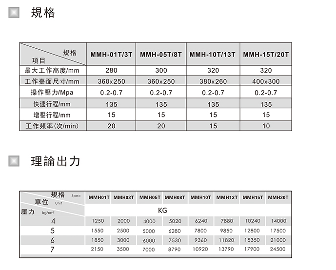 四柱型增壓壓床 MMH-01T,MMH-03T,MMH-05T,MMH-08T,MMH-10T,MMH-13T,MMH-15T,MMH-20T