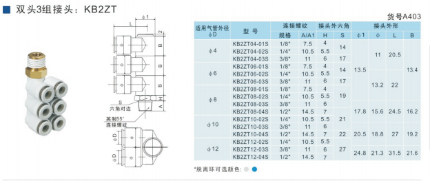 SMC型雙頭3組接頭KB2ZT04-01S,KB2ZT04-02S,KB2ZT04-03S,KB2ZT06-01S,KB2ZT06-02S,KB2ZT06-03S,KB2ZT08-01S,KB2ZT08-02S,KB2ZT08-03S,KB2ZT08-04S,KB2ZT10-01S,KB2ZT10-02S,KB2ZT10-03S,KB2ZT10-04S,KB2ZT12-02S,KB2ZT12-03S,KB2ZT12-04S,