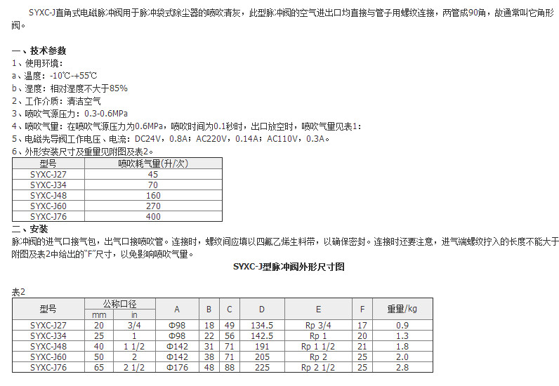 淹沒式脈沖閥SYXC-Y42,SYXC-Y60,SYXC-Y76,