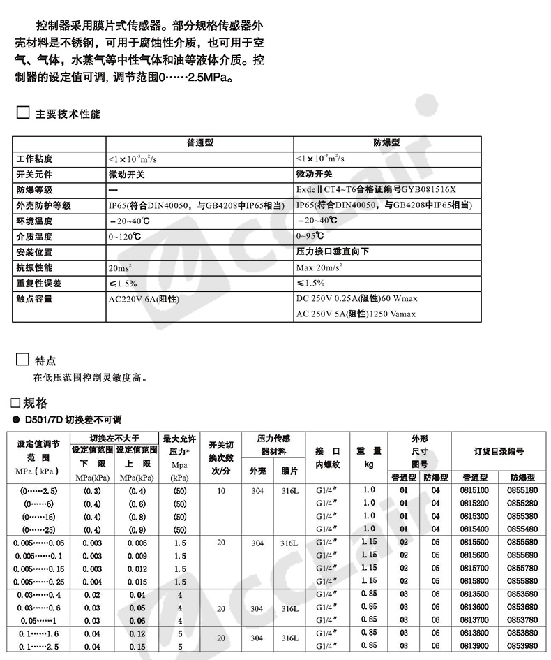 0815107,0813507,0815207,0813607,壓力控制器 D501/7DK切換差不可調(diào)