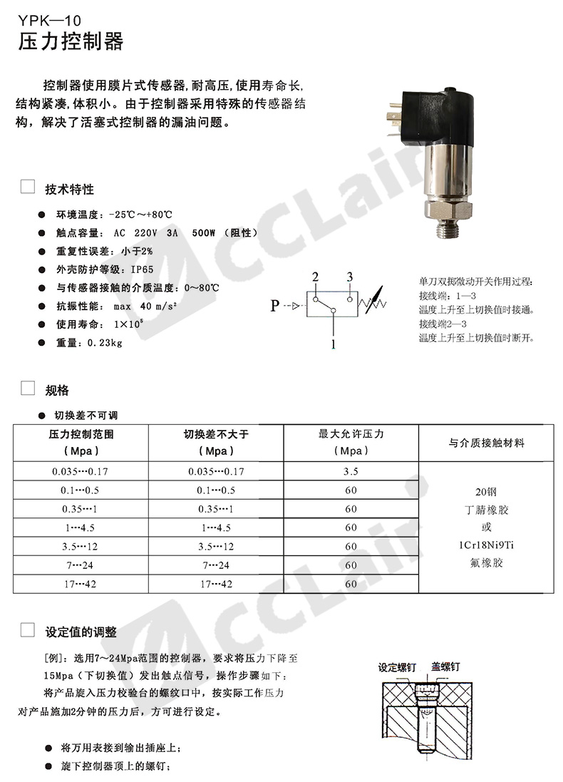 YPK-10 0.035~0.17MPA,YPK-10 3.5~12MPA,YPK-10系列 壓力控制器 YPK-10 0.1~0.5MPA,YPK-10 7~24MPA, YPK-10 0.35~1MPA,YPK-10 17~42MPA, YPK-10 1~4.5MPA ,