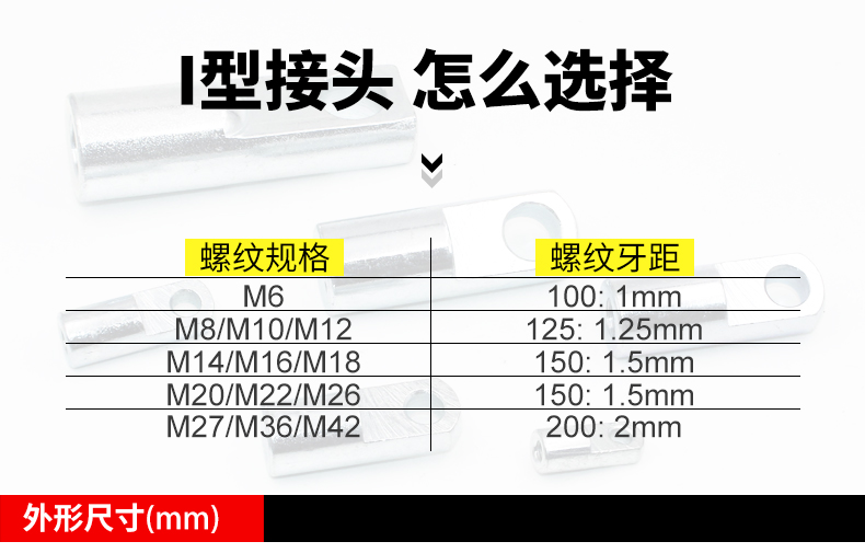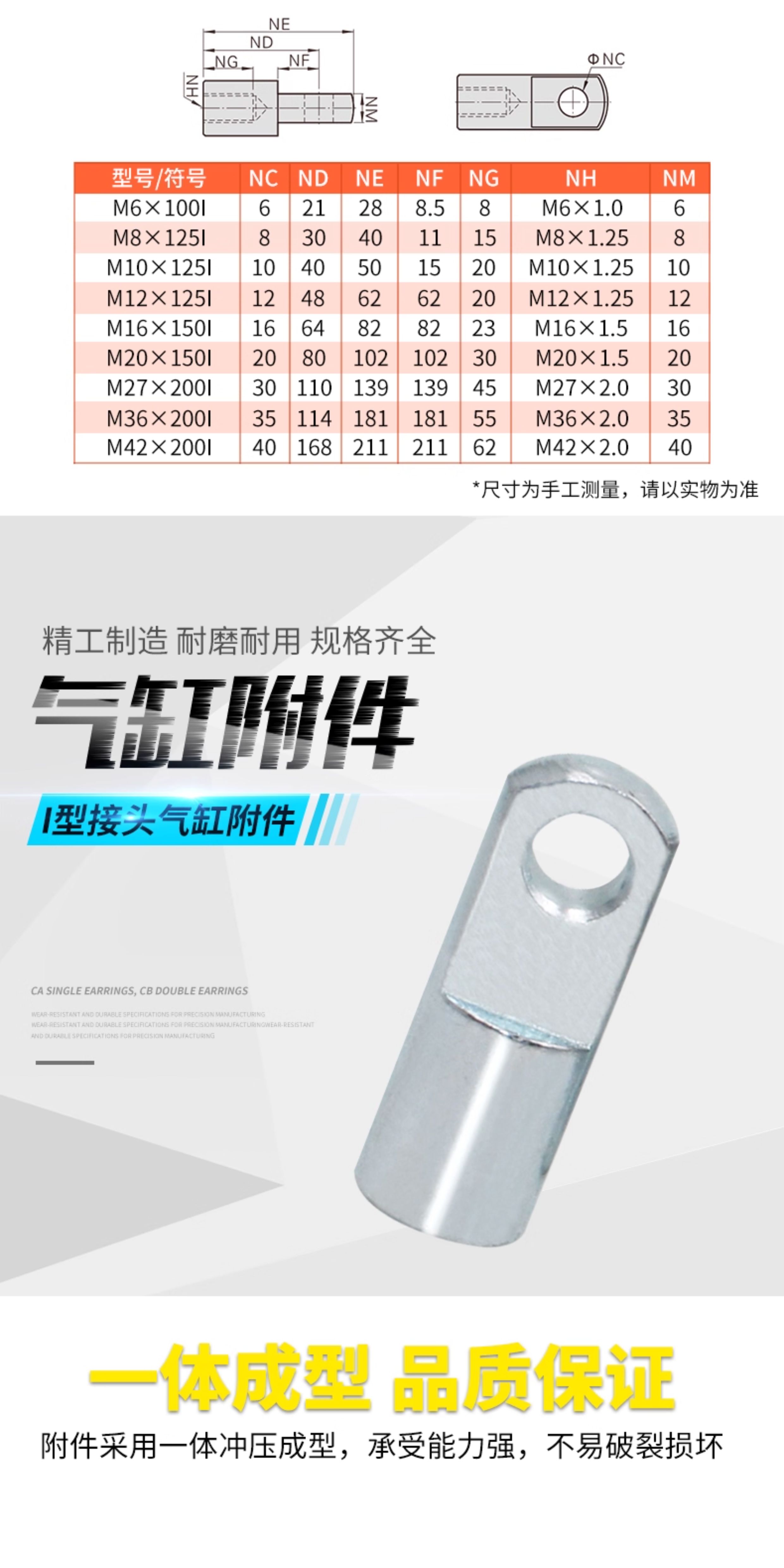 I-16 (M6*1),I-20 (M8*1.25),I-25 (M10*1.25),I-32 (M10*1.25),I-40 (M12*1.25),I-50 (M16*1.5),I-63 (M16*1.5),I-80 (M20*1.5),I-100 (M20*1.5),I-125 (M27*1.5),I-160 (M36*2),I-200 (M36*2)氣缸附件