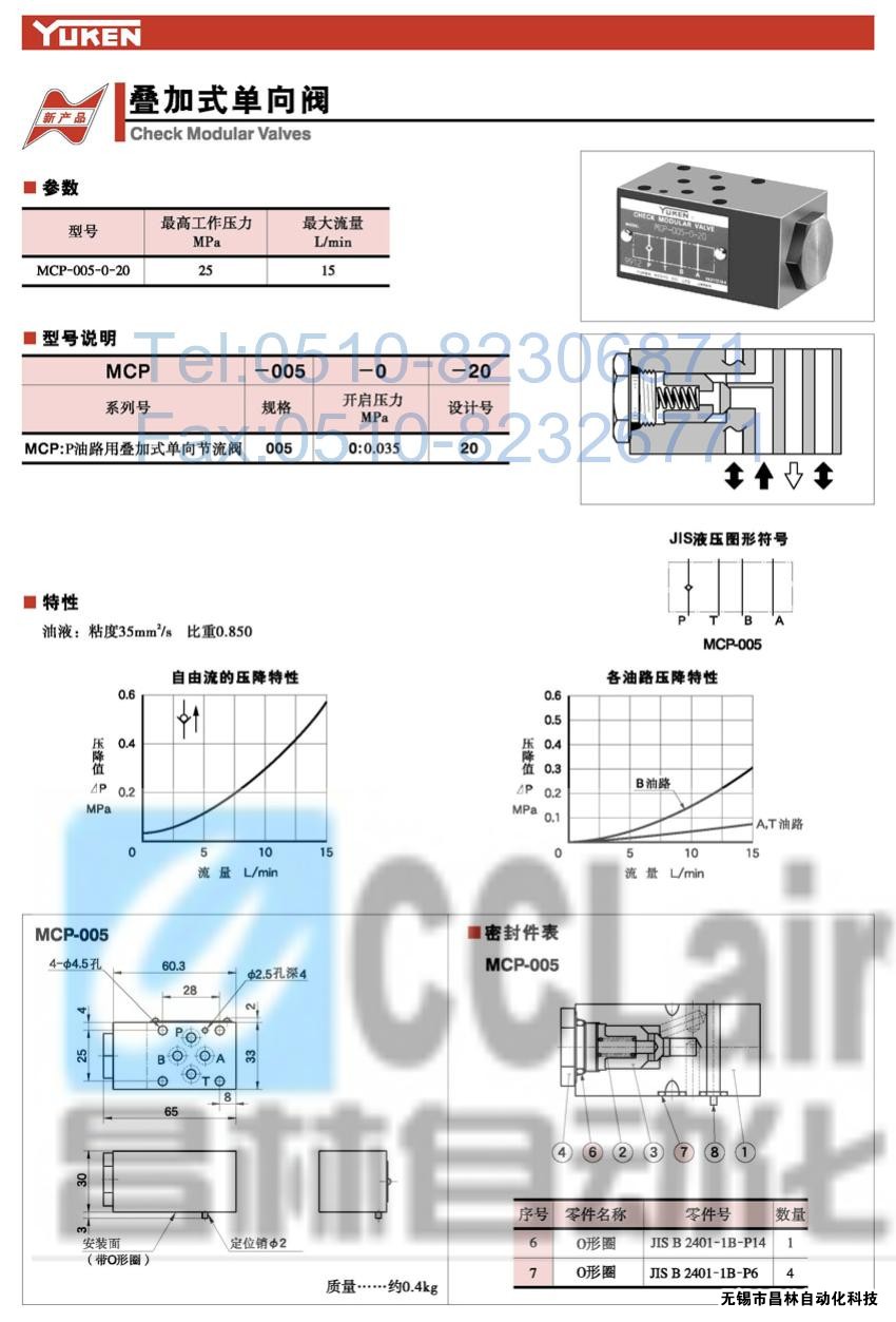 MCP-005-0-20,疊加式單向閥,榆次油研疊加式單向閥,YUKEN疊加式單向閥