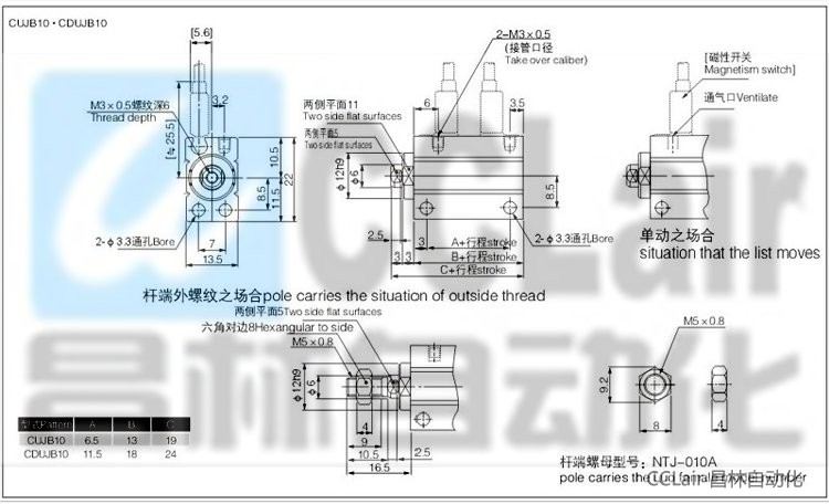 CDUJB10-6,CDUJB10-8,CDUJB10-10,CDUJB10-15,CDUJB10-20,自由安裝型氣缸