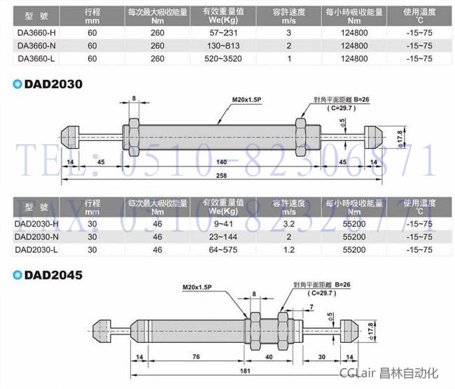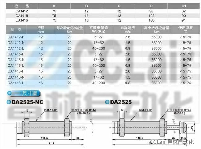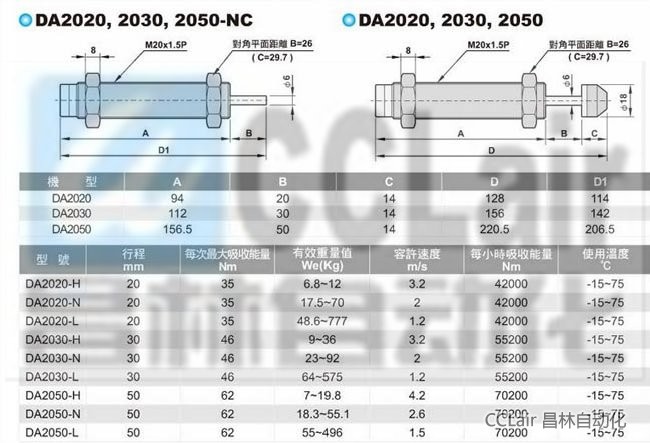 DA0806-H,DA0806-N,DA0806-L,DA1005-H,DA1008,DA2020,DA2030,DA2050,DA1210,DA1412,DA1415,DA1416,油壓緩沖器