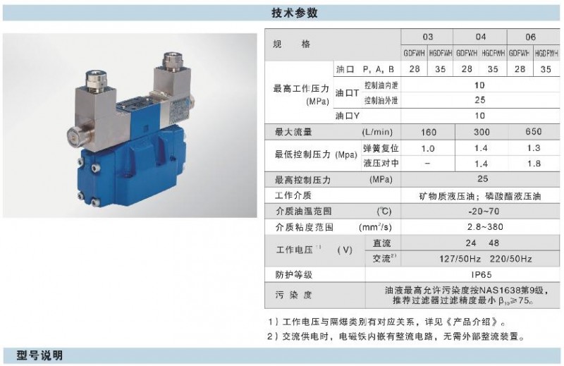二、技術(shù)參數(shù):規(guī)格 06 10 最高工作壓力 (MPa) 31.5 最大流量 (L/min) 220 430 工作介質(zhì) 礦物質(zhì)液壓油;磷酸脂 介質(zhì)油溫范圍 (℃) -20~70 介質(zhì)粘度范圍 (mm2/s) 2.8~380 開啟壓力 (MPa) a:0.05 b:0.4 工作電壓 (V) 直流 24 *交流 127, 220 防護(hù)等級(jí) IP55