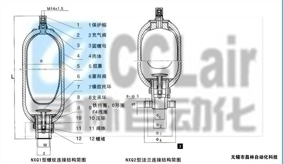 NXQ-蓄能器內(nèi)腔由皮囊分為兩個(gè)部分:囊內(nèi)裝氮?dú)?,囊外充液壓油。?dāng)液壓泵將液壓油壓入畜能器時(shí),皮囊就受壓變形,氣體體積隨壓力增加而減少,液壓油被逐漸儲存。若液壓系統(tǒng)工作需要液壓油,則畜能器將液壓油排出,使系統(tǒng)的能量得到補(bǔ)償