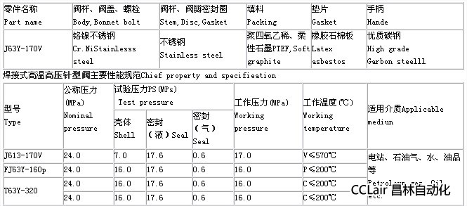 J63Y焊接式高溫高壓針型閥針型閥主要零件材料Materials for main parts