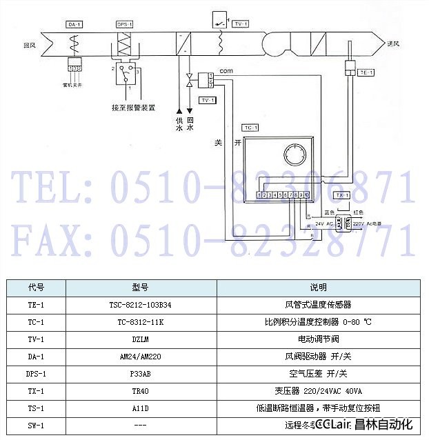 本系統(tǒng)適用于空調(diào)系統(tǒng)的新風(fēng)機(jī)組冬、夏季溫度控制。如下圖所示,由溫度傳感器TE-1,比例積分溫度控制器TC一1和電動(dòng)調(diào)節(jié)閥TV一1組成送風(fēng)溫度控制系統(tǒng),安裝在送風(fēng)管道的TE一1,把檢測到的溫度信號(hào)傳送至TC一1,由TC一1將TE一1的檢測值與設(shè)定值不斷比較,同時(shí)不斷地輸出信號(hào),控制TV一1的開度連接可調(diào),最終使TE一1測量的環(huán)境溫度保持在設(shè)定的溫度范圍內(nèi)。