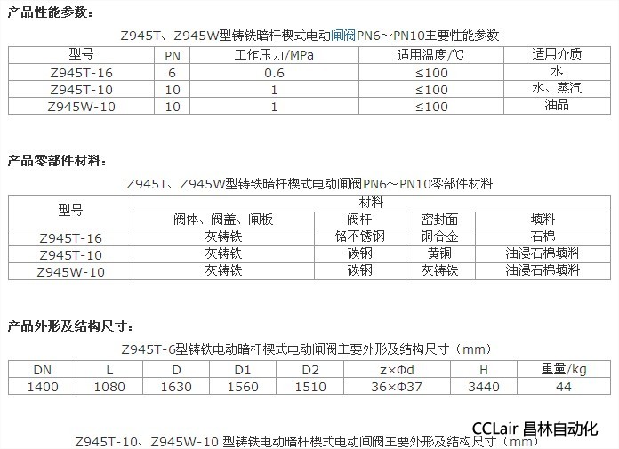 Z945T、Z945W 型 PN6、PN10 型鑄鐵電動暗桿楔式閘閥:電動、法蘭連接、暗桿楔式剛性單閘板,閥座密封面材料為銅(Z945T)、灰鑄鐵(Z945W),公稱壓力 PN6~PN10,閥體材料為灰鑄鐵的閘閥。
