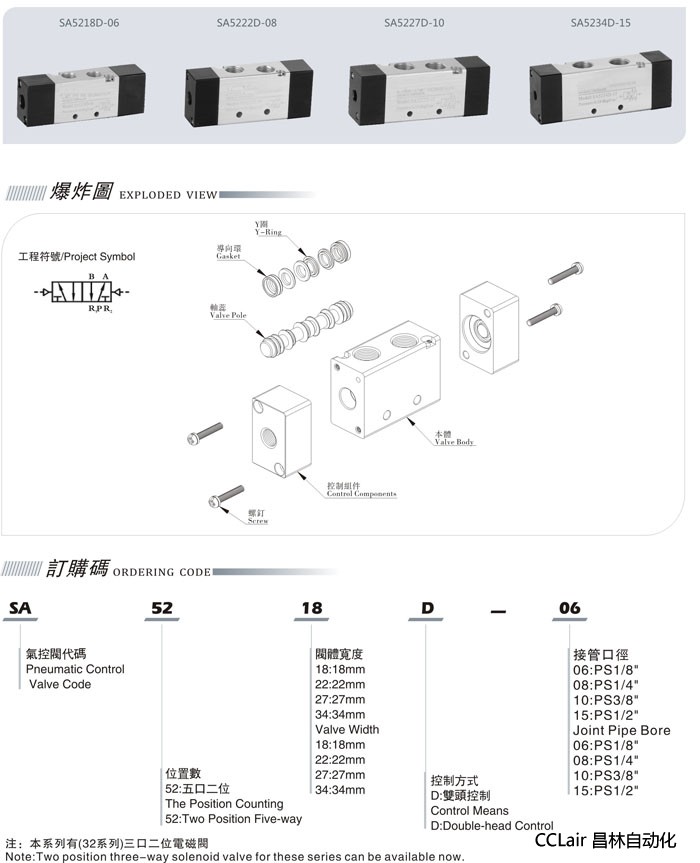 SA5222D-06,SA5218D-06,SA5227D-08,SA5234D-10,五口二位氣控閥