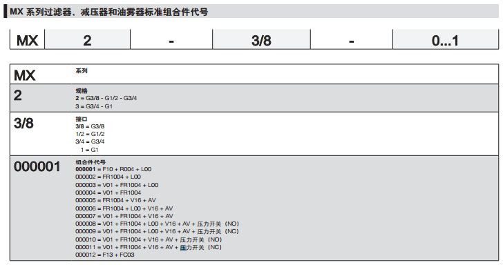 產(chǎn)品: 瀏覽次數(shù):792MX2-3/8-000001,MX3-1/2-000003,MX2-3/4-000010camozzi氣源處理裝置組合件