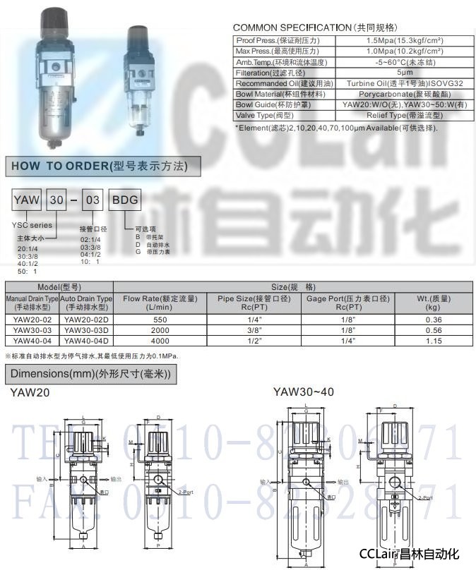 YAW20-02,YAW30-03,YAW40-04,空氣過濾器帶減壓閥