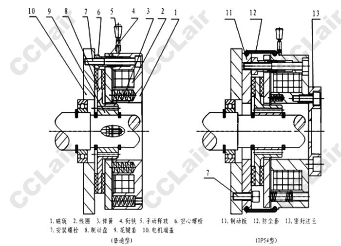 3、當(dāng)制動(dòng)器裝在電機(jī)上,若電機(jī)起動(dòng)困難或有噪音時(shí),應(yīng)檢查制動(dòng)器,按本《說明書》第三條調(diào)整。