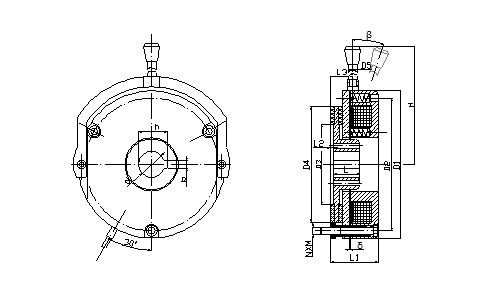該系列電磁失電安全制動(dòng)器主要由勵(lì)磁部分(磁軛1、線圈2、彈簧3、銜鐵4)、制動(dòng)盤7、花鍵套8等主要零部件組成。勵(lì)磁部分通過安裝螺栓6安裝在機(jī)座上,旋轉(zhuǎn)安裝螺栓6調(diào)整氣隙至初始安裝氣隙推薦值δ后(見安裝尺寸參數(shù)表),反向旋出空心螺栓5,頂緊勵(lì)磁部分?;ㄦI套通過矩形花鍵與傳動(dòng)軸相連;制動(dòng)盤7與花鍵套8通過漸開線花鍵嚙合。當(dāng)線圈斷電時(shí),在彈簧力的作用下,制動(dòng)盤7與銜鐵4、機(jī)座9端面產(chǎn)生摩擦力,通過花鍵套8傳給傳動(dòng)軸,使軸制動(dòng)。當(dāng)線圈通電后,在電磁力作用下,銜鐵4被吸向磁軛1,使制動(dòng)盤7松開,傳動(dòng)軸制動(dòng)解除。