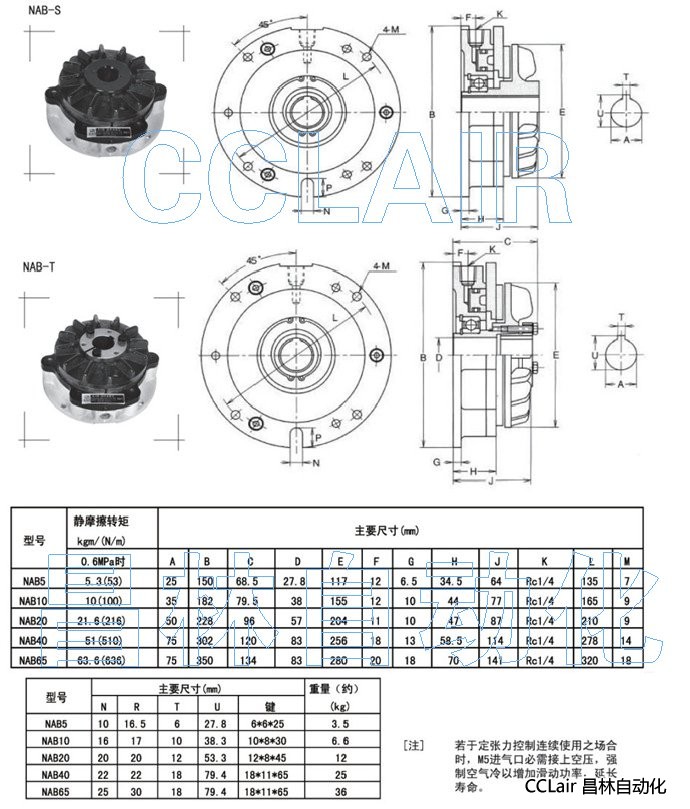 NAB5,NAB10,NAB20,NAB40,NAB65,(標(biāo)準(zhǔn)型)空壓通軸式離合器