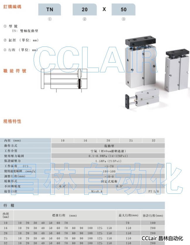 TN-10X10,TN-16X10,TN-20X10,TN-25X10,TN-32X10, 雙軸氣缸