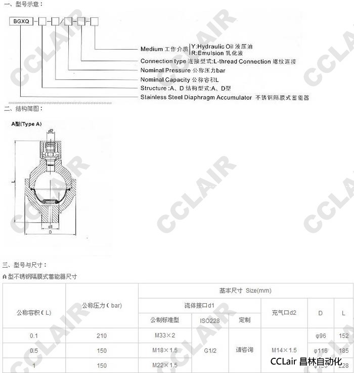 BGXQ-A-0.1/210-L-R,BGXQ-A-0.5/150-L-R,BGXQ-A-1/150-L-R,不銹鋼隔膜式蓄能器 |