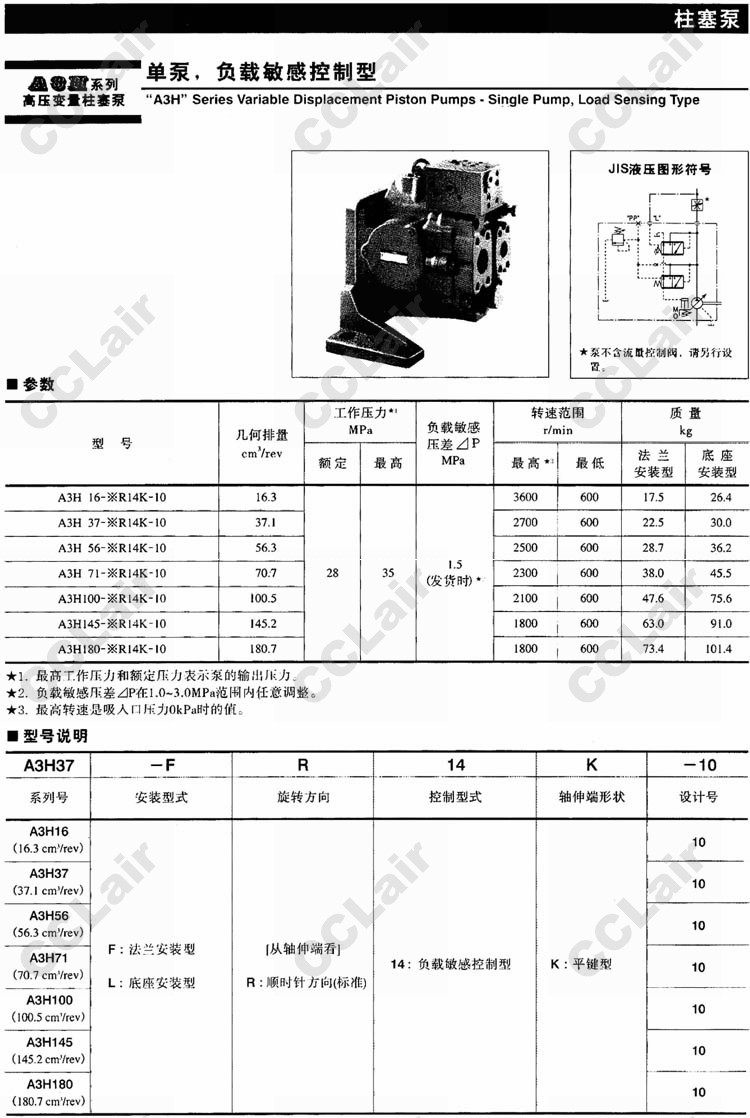 A3H16,A3H37,A3H56,A3H71,A3H100,A3H145,A3H180,A3H16-FR14K-10,高壓變量柱塞泵