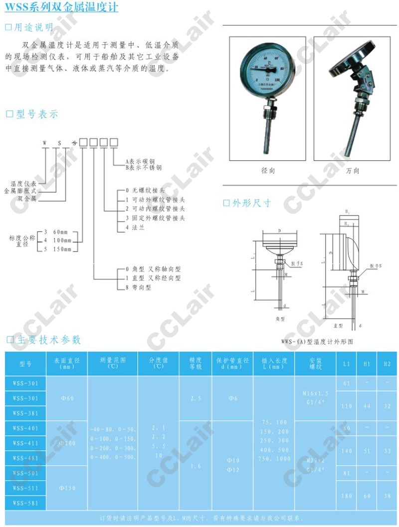 WSS-301,WSS-381,WSS-401,WSS-411,WSS-481,WSS-501,WSS-511,WSS-581,雙金屬溫度計,CCLair |