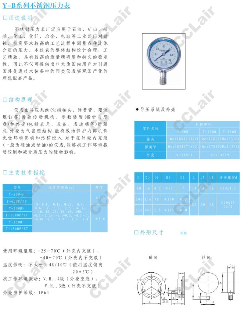 Y-60BF/ZT,Y-100BF,Y-100BF/ZT,Y-150BF,T-150BF/ZT,不銹鋼壓力表,CCLair