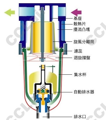 壓縮空氣由入口端進(jìn)入內(nèi)部,即碰到圓形基座而產(chǎn)生旋轉(zhuǎn)氣流,因過濾器外圍設(shè)有散熱鰭片,內(nèi)部設(shè)有擾流凸塊,會(huì)使壓縮空氣降低溫度與流速,再往下通過遮蓋濾蕊之旋風(fēng)分離筒,水份與污垢不會(huì)直接觸及濾蕊,而可快速分離集結(jié)到下方,為防止水份子反射到濾蕊,再設(shè)一迴旋擋盤,將水份與雜質(zhì)折射到下方之集水杯內(nèi)貯存,由AD-34 自動(dòng)排水器定量排放。壓縮空氣經(jīng)過多重?cái)_流分離,去除水份與雜質(zhì)後,再由迴旋擋盤反轉(zhuǎn)向上通過可重覆使用的金屬燒結(jié)濾蕊,純淨(jìng)而高品質(zhì)的壓縮空氣即由出口端進(jìn)入管路中。